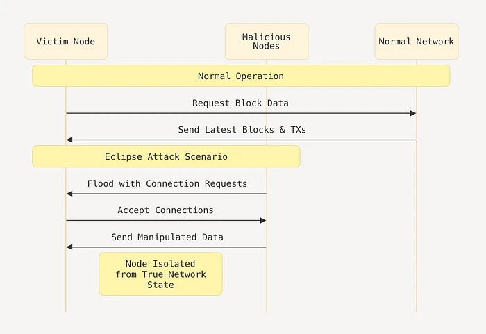 - 日蚀攻击:恶意节点包围目标,拦截所有通信并提供虚假数据。(使用 Canva 或 Lucidchart 为你的 Medium 帖子创建此图。)