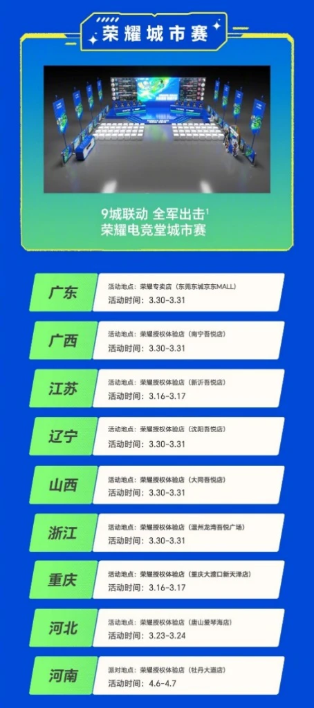 2024年3月1日至4月7日,荣耀电竞堂联合英雄联盟手游开启“英雄集结,荣耀开赛”大型联动活动。连续四个周末,荣耀电竞堂将在全国9个城市举办9场城市赛,以及 80 多场门店活动,玩家可以通过组队参赛赢得荣耀送出的多重惊喜大奖。在联动活动外,荣耀还策划了花样繁多的“新学期,新装备”开学季活动,为广大学子精心准备了入手更划算的手机、平板、电脑等爆品,提供以旧换新、分期免息、换购加赠等福利,帮助大家轻松入手高品质返校装备,畅享智慧新体验。