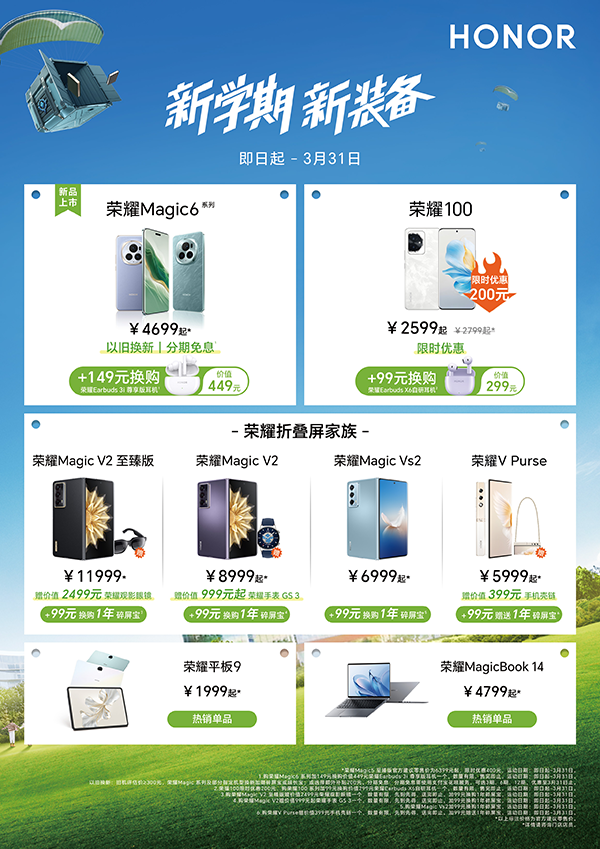 新学期的钟声已响起,莘莘学子又开启了生活新篇章。即日起至3月31日,荣耀“新学期,新装备”开学季活动推出一系列购机服务及福利,学生们前往荣耀全国线下门店购买科技旗舰荣耀Magic6系列,即可加149元换购价值449元的荣耀Earbuds 3i耳机,还可享以旧换新、分期免息权益,学生党轻松购机无压力;购买全新一代数字系列手机荣耀100限时优惠200元,加99元可换购荣耀Earbuds X6耳机;购买折叠屏家族荣耀Magic V2至臻版、荣耀Magic V2、荣耀Magic Vs2、荣耀V Purse,以及热销单品荣耀平板9、荣耀MagicBook 14,均可享购机赠礼、换购碎屏宝等加码福利。