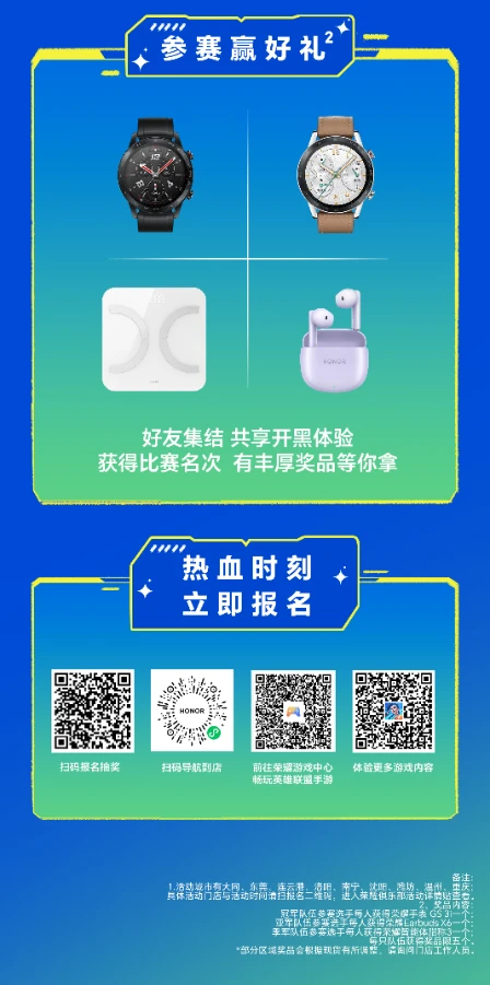 本次活动,荣耀设置了丰厚的赛事好礼:冠军队伍参赛选手每人可获赠荣耀手表GS 3i;亚军队伍参赛选手每人可获赠荣耀Earbuds X6;季军队伍参赛选手每人可获赠荣耀智能体脂称3;每支队伍获得奖品限量五个。如果你也对此感兴趣,快叫上你的小伙伴们一起扫码报名,点燃热血时刻!