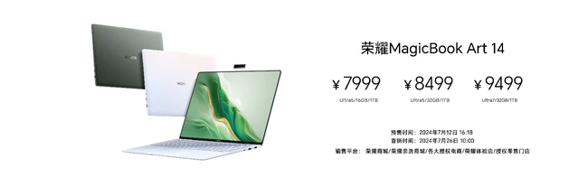 作为荣耀旗下首款超轻薄AI PC,荣耀MagicBook Art 14的AI能力和体验全面升级,在平台级AI使能的OS Turbo 3.0技术加持下,打造出行业领先的续航和性能体验。荣耀MagicBook Art 14最高搭载英特尔酷睿Ultra 7 155H处理器,拥有日出印象和夏日橄榄两款配色,售价7999元起,将于2024年7月12日16:18全渠道开启预售,2024年7月26日10:00正式首销。