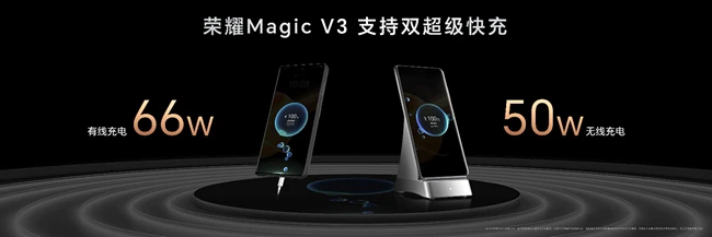 在续航方面,荣耀Magic V3再次突破技术壁垒,搭载的第三代青海湖电池是业界首个硅含量突破10%的硅碳负极电池,电池平均厚度只有2.6mm,但却实现了高达5150mAh的大容量。配合自研的能效增强芯片HONOR E1和荣耀都江堰电源管理系统,能量管理精度得到了3倍的提升,能够智能识别不同充放电场景。其出色的续航表现通过了中国质量认证中心智能手机“24小时续航认证”,即使高负载使用下也能轻松应对一整天的需求。此外,荣耀Magic V3和荣耀Magic Vs3均支持66W有线快充和50W无线快充,可实现快速电量恢复。