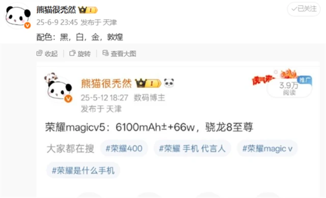 在配色策略上,爆料显示Magic V5将延续与中国敦煌文化的结合,继续提供“敦煌”主题配色,同时新增金色选项。而前代颇受欢迎的“苔原绿”配色则可能被取消。随着该产品预计发布时间的临近,关于荣耀Magic V5的更多规格细节或将陆续揭晓。
