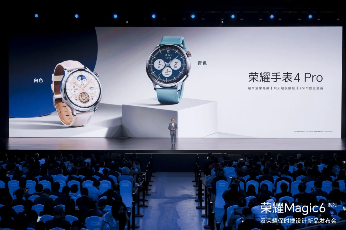 荣耀还为旗舰智能手表荣耀手表4 Pro,推出白色和青色两个全新的款式,分别搭配白色皮表带和蓝色氟橡胶表带,以及全新的表盘设计。荣耀手表4 Pro致敬经典机械手表的精湛工艺和设计,展现出无可挑剔的独特美感;集成“一主二协”三颗处理芯片带来典型模式10天超长续航;还支持eSIM和一表双待等强大的独立通信能力。全新配色的荣耀手表4 Pro售价依然1599元起,即日起开启预售,2024年1月11日20:30正式开售。