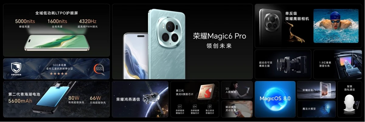 荣耀始终坚持双轮驱动的产品主义,一方面深入洞察用户需求,从消费者需求出发定义产品,另一方面在前瞻技术上加大投入,带来开创性的技术解决方案。此次荣耀Magic6系列,为消费者带来了重构手机直连卫星通信解决方案的荣耀鸿燕通信、全新升级的第二代青海湖电池、超耐摔的荣耀巨犀玻璃、单反级荣耀鹰眼相机、持续引领的荣耀绿洲护眼技术、引领操作系统变革的魔法OS等创新体验。荣耀Magic6系列售价4399元起,将于1月18日正式开售。