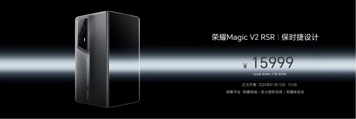 此次发布会上,荣耀还与保时捷设计共同发布了全球首款保时捷设计折叠屏手机荣耀Magic V2 RSR 保时捷设计。产品机身设计灵感来自保时捷经典飞线,配备飞线式溜背舷窗、5D羽纤机身,以及斯图加特原厂大师调色的玛瑙灰配色。产品外屏上,荣耀带来行业首发的荣耀金刚巨犀玻璃,基于第二代纳米微晶玻璃技术,通过超跑引擎同款超耐磨材料氮化硅,使屏幕在10倍抗摔的基础上实现10倍抗刮的特性,并通过了SGS多场景玻璃抗刮耐摔能力五星金标认证。荣耀Magic V2 RSR保时捷设计售价为15999元,将于2024年1月12日10:08在荣耀商城、各大授权电商、荣耀体验店、保时捷中国官网、授权保时捷中心正式开售。