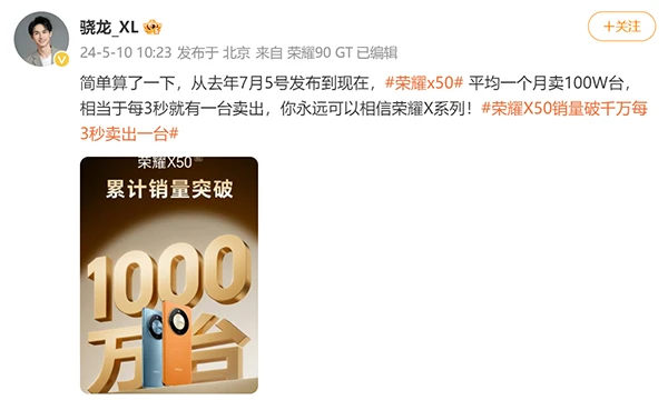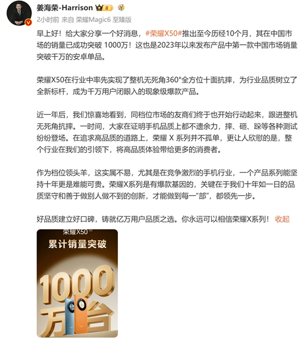 十年品质筑牢口碑长城,荣耀X系列手机再创佳绩。5月10日,荣耀中国区CMO姜海荣发文称,荣耀X50发售10个月,中国区销量已突破千万,凭借整机无死角360°全方位十面抗摔的硬核品质成为2023年后第一款千万安卓单品。作为千元档爆款产品,荣耀X50以品质为基,重新定义行业新标准,以体验为王,成为千万用户闭眼入的现象级爆款产品。