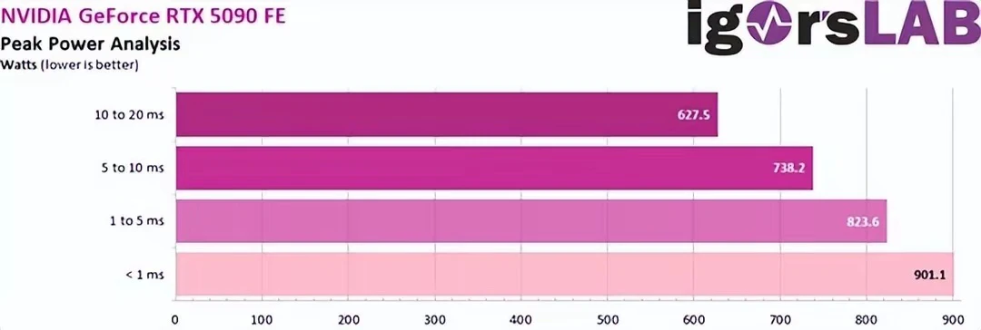 除了典型功耗外,瞬时峰值功耗(Peak Power)也是一个不容忽视的指标。测试结果显示,在 10-20 毫秒的时间窗内,RTX 5090 的瞬时功耗可高达 627.6W,而在更短的时间内,瞬时功耗甚至可以达到 823.6W,极短的 1 毫秒时间内,峰值功耗更是达到了惊人的 901.1W。