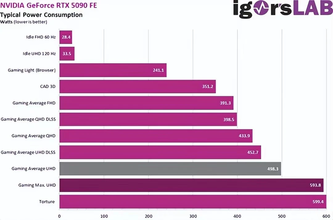 RTX 5090 性能得到了显著提升,但随之而来的却是功耗的增加,这对于玩家们选择电源提出了更高要求。根据 Igor's Lab 的测试数据,我们可以清楚地看到,在不同使用场景下,RTX 5090 的功耗差异十分明显。