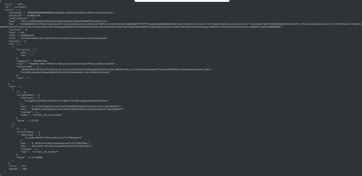 curl --data-binary '{"jsonrpc": "1.0", "id": "curltest", "method": "getrawtransaction", "params": ["2d1228abf06836b1173936061fec0384e82e3b684d7950a27f06a06f587400d3", true]}' -H 'content-type: application/json' <QUICKNODE_BITCOIN_URL> 将 QUICKNODE_BITCOIN_URL 替换为你的比特币节点的 HTTPS URL,这是我们在上一步中获得的。上面是向我们的节点发出的一个 cURL 请求,以及 getrawtransaction 方法。为了获得这个,我们将 ping 我们的节点来解析该方法。我们必须为此方法传递两个参数。第一个是要查询的交易的交易 ID。第二个是一个布尔值,如果设置为 false,则返回一个字符串;否则,它返回一个 JSON 对象。