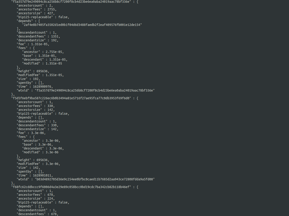 第 21-33 行:Vout 显示了内存池中使用此特定交易作为输入的交易的列表。