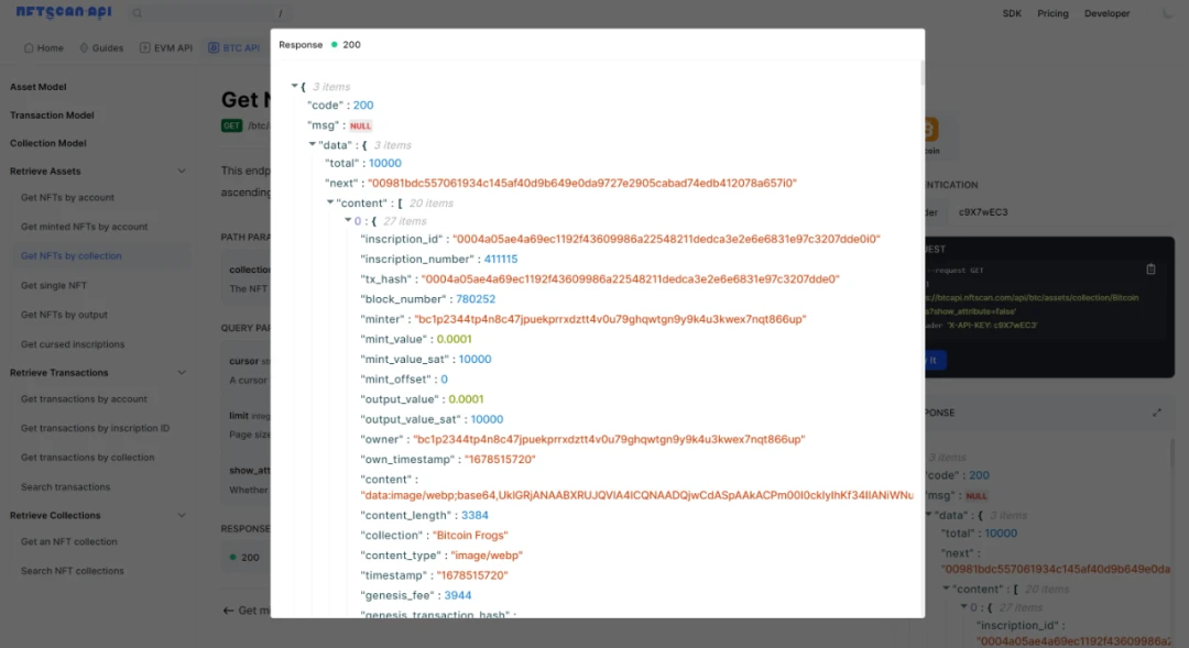 例如,构建一个请求获取 Bitcoin Frogs NFT 数据的 API 请求,查找 NFTScan BTC API 的文档或参考文档后,这里使用接口