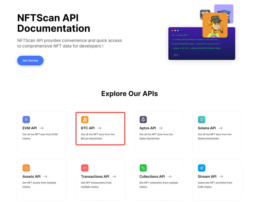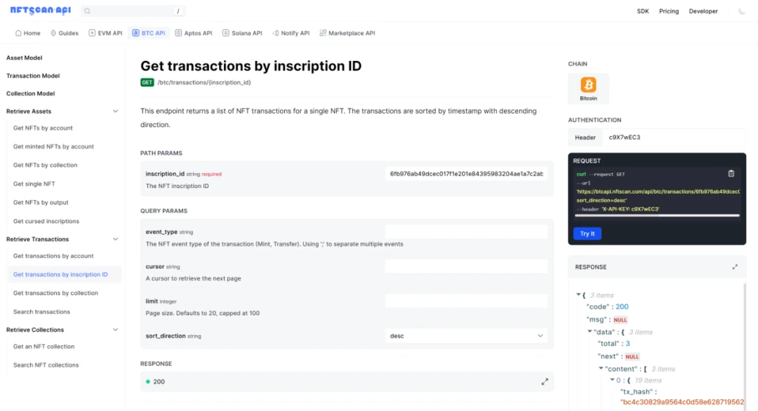 一旦在 NFTScan 的 API 文档中找到所需的 BTC API 接口和参数后,开发者可以使用选择的编程语言编写 API 请求代码。访问 NFTScan 的 API 文档,会提供以下信息:
