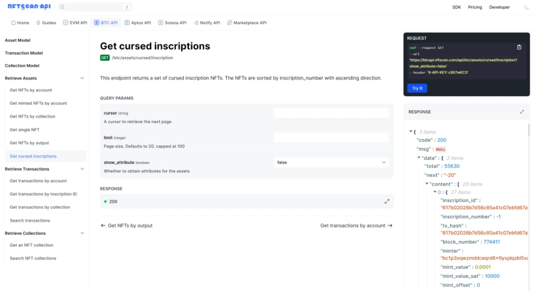 Get cursed inscriptions:该接口返回一组被诅咒的铭文 NFT,NFT 按 inscription_number 升序排序。比特币 NFT 协议 Ordinals 已经升级到了 v0.6.0 版本,该版本中最引人注目的更新当属对「诅咒铭文」的支持, 一些被成功刻录的铭文没有被索引器分配序号而无法被检索,即被称为「诅咒铭文」。NFTScan 同样对其数据进行整合收录,方便开发者们使用。