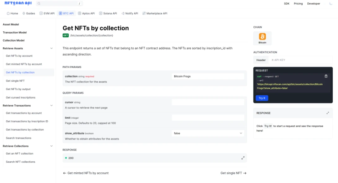 Get NFTs by collection:通过 NFTScan BTC API Retrieve Assets 的接口之一“/btc/assets/collection/{collection}”开发者可以通过检索 NFT Collection 的名称,该接口返回一组属于 NFT 合约地址的 NFTs,并且按 inscription_id 升序排序。