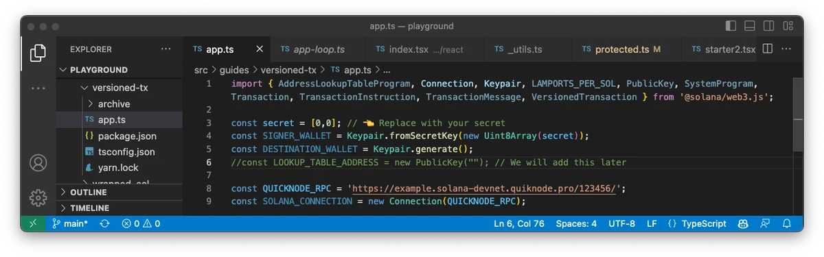 如果你是从我们之前的指南:如何在 Solana 上使用版本化交易过来的,你可以重用你的 app.ts 并跳到组装版本 0 交易部分。否则,请设置你的项目: