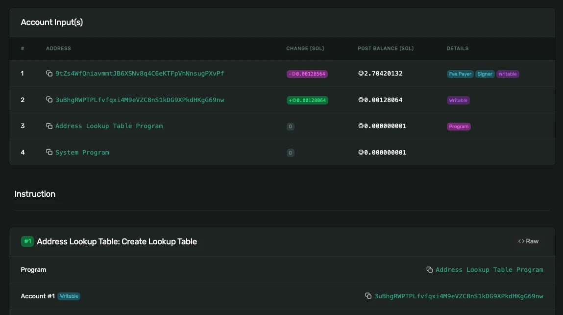 我们的查找表账户地址是:3uBhgRWPTPLfvfqxi4M9eVZC8nS1kDG9XPkdHKgG69nw:
