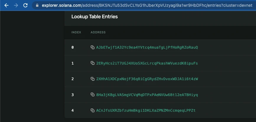 你应该在终端中看到类似的交易流程,并成功获得指向你的交易和你的查找表条目在 Solana Explorer 上的链接。转到查找表条目。你应该会看到你的表存储的所有公钥列表: