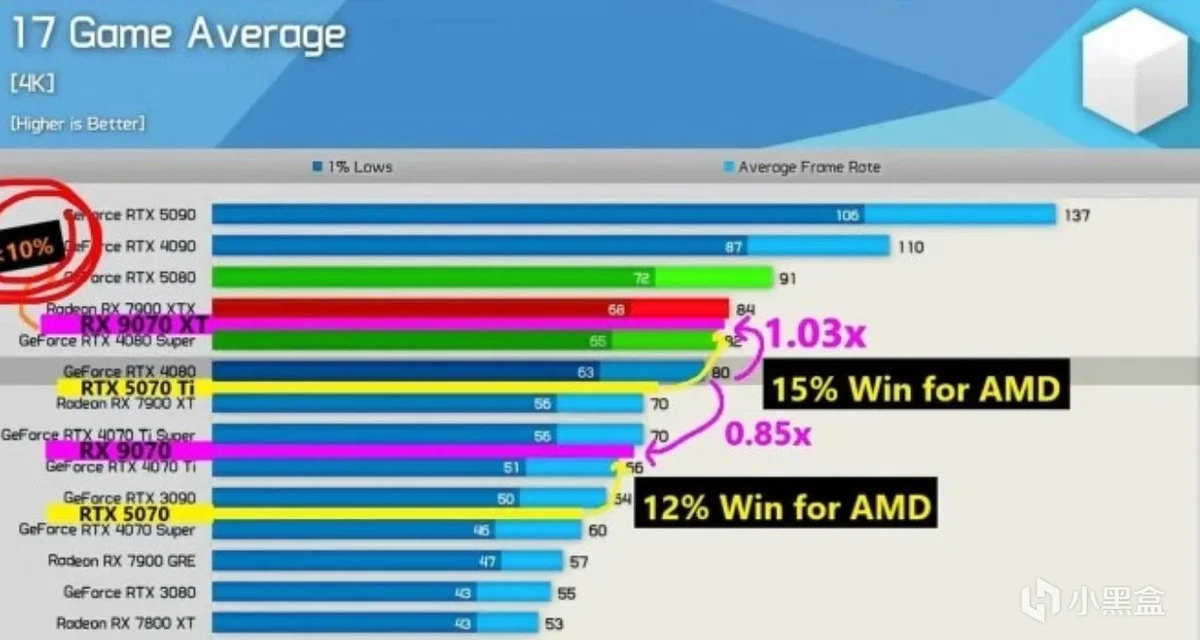 在 17 款 4K 分辨率光栅化测试的游戏 中,RX 9070 平均比 RTX 5070 快 12%,而 RX 9070 XT 则比 RTX 5070 Ti 快 15%!此外,RX 9070 XT 与 RTX 5080 之间的性能差距仅为 10%,但这次是老黄家绿队略占上风。