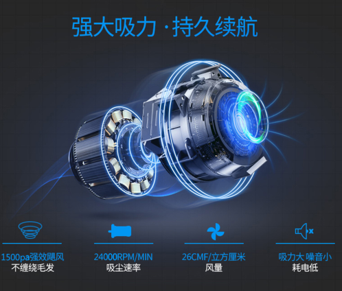 无刷电机,吸力大,噪音小,能耗低,24000RPM/MIN的吸尘速率可实现快速吸尘,1500pa的强效飓风,不怕毛发缠绕。浮动V型滚刷,可以快速聚拢灰尘,对地板缝隙等深层次的灰尘也能深入清理,而且是紧贴地面进行清扫,不会出现灰尘飞扬的情况,不需要进行二次清扫。