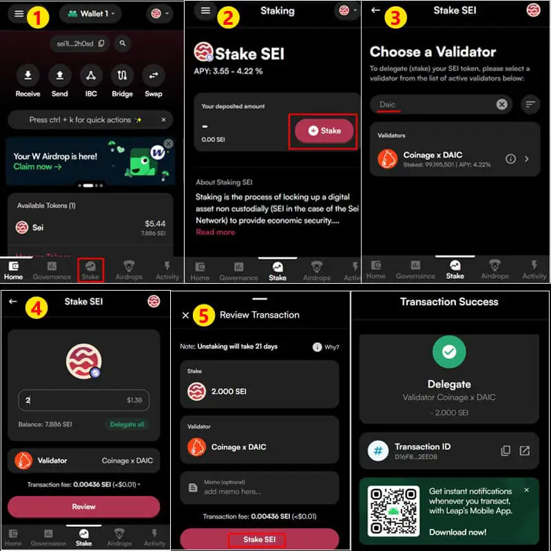 按照以下五个步骤说明来 Stake 你的 SEI 代币。