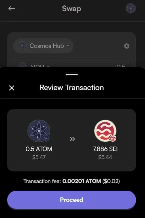 对于寻求可能更简单方法的用户,除了传统的交易平台之外,还有两种有趣的选项。 首先,一些钱包(如 Keplr 和 Leap)支持直接将 Cosmos 上的代币兑换为 SEI。 这种方法利用了已建立的 Cosmos 网络,并且无需中间交易所。
