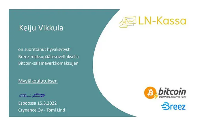 因此,LN-Kassa 在 Tauko Baari 启动了闪电网络,Antti 保持了这一势头。他采取的下一步是培训他的员工,教他们如何使用 Breez PoS 模式 进行实际交易,并为那些成功完成培训的人颁发证书。Antti 说 Breez 像他们的银行卡支付系统甚至现金支付一样易于学习和使用。这就是目标。