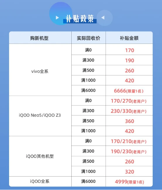 以通过以旧换新的方式购买iQOO Neo5系列手机为例,iQOO老用户旧机回收满0元,可获得270元补贴,普通用户回收满0元,可获得170元补贴;以旧换新购买vivo全系机型,回收价满0元,即可获得170元补贴,至高可获6666元限量补贴。详细规则可以前往苏宁易购进入以旧换新查看,或搜索“手机以旧换新”直达以旧换新主会场了解具体活动玩法。