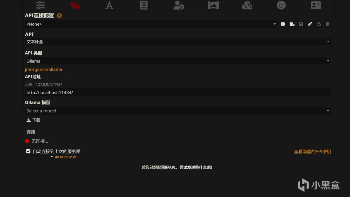 拿我经常用的“Ollama”为例,在启动ollama之后,运行酒馆并在里面找到“API连接配置”(顶部的小插头)。如果接入本地模型请在“API栏”选择“文本补全”,并在在“API地址”一栏输入ollama的本地端口,没找到的朋友可以直接输入图里的地址