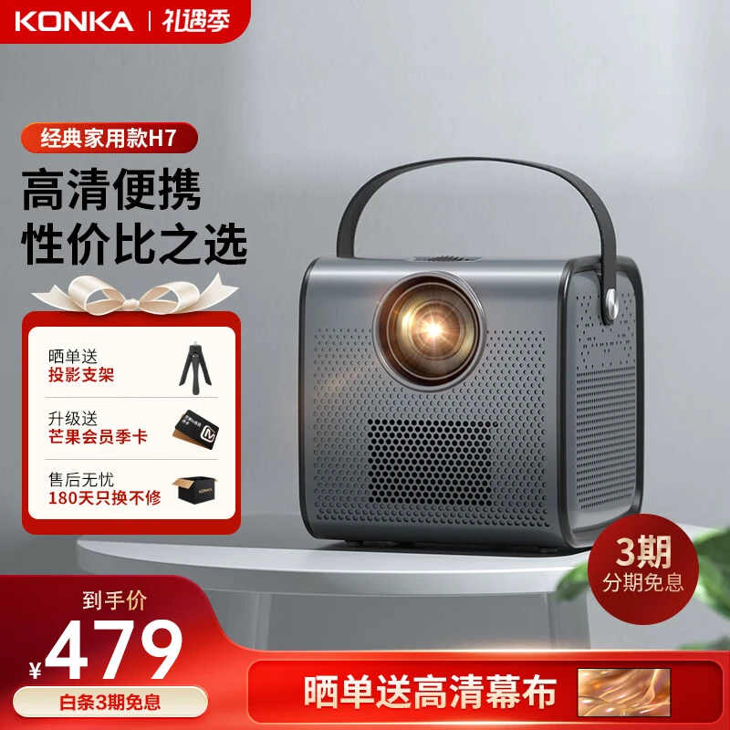 康佳H7家用投影仪,带来全高清1080P画质享受,手动四角梯形校正,轻松实现侧投,保证清晰观影。搭载HDR3解码技术,图像细节丰富,色彩层次分明。1.2:1投射比,小卧室也能享受大屏幕观影体验。配备AI智能语音遥控,操作便捷。康佳原厂音响,音质出众,支持蓝牙连接。每天使用8小时,使用寿命可达5年以上。无网络时,U盘播放功能依然畅享影音。内置安卓智能电视系统,资源丰富,满足全家娱乐需求。