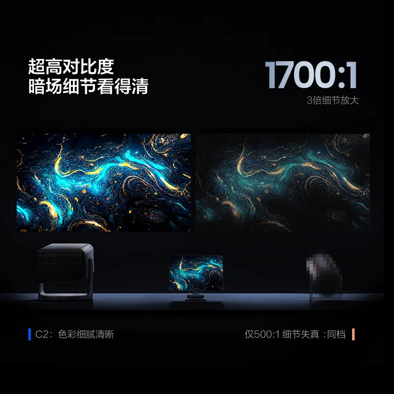 在实际使用中,我发现C2的智能功能非常贴心,比如AI感知色彩模组和墙面颜色自适应,让画面色彩更加真实,观影不受环境限制。而且,它的万向灵动云台设计,让我轻松调整投影角度,无论放在哪里都能找到最佳观影位置。