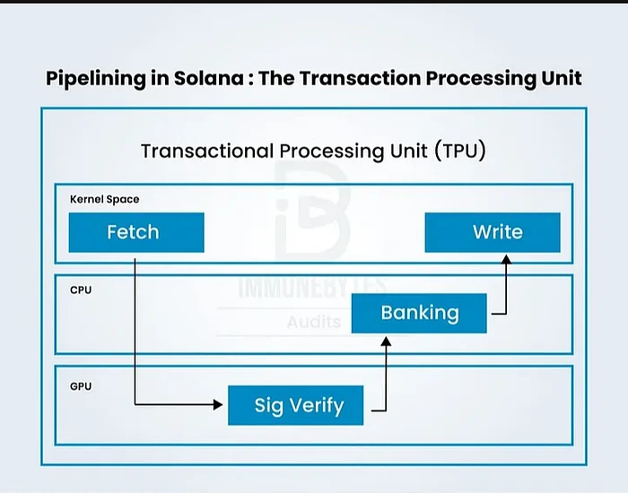 Pipeline(流水线):事务验证过程使用流水线。它用于在特定步骤中处理数据流,不同的硬件负责每个步骤。数据处理单元 TPU 在内核级别进行数据获取,在 GPU 级别进行签名,在 CPU 级别进行银行业务,在内核级别进行写入。在 TPU 开始将区块发送给验证者时,它已经收集了下一批口袋并开始对其进行签名。