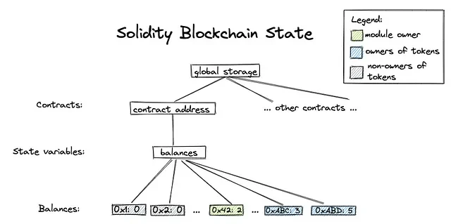 在 Solidity 中,区块链的状态是围绕地址组织的。每个地址(如用户的钱包或智能合约)都有相关的存储,资产通常表示为此存储中的映射条目。这种模型可能会导致在不同地址和合约之间管理资产的复杂性。