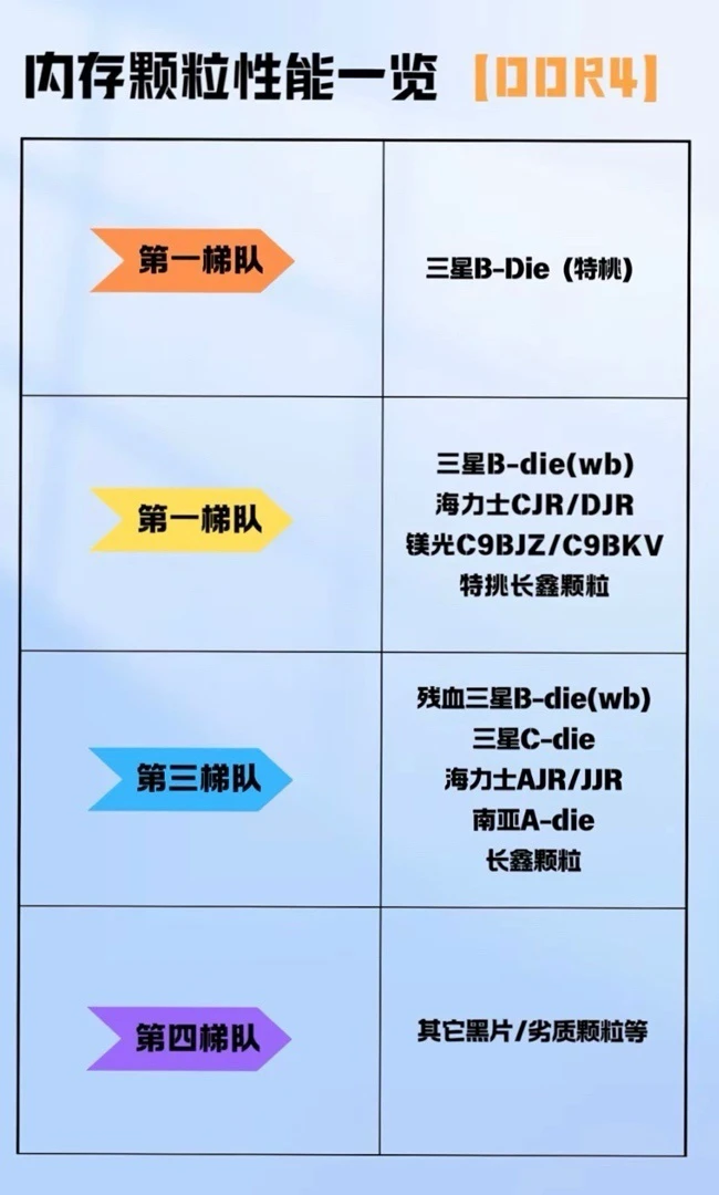 刚才就说过内存最重要的颗粒,我这有两张图D4和D5现在内存等级的榜单,如果有超频想法就尽量上第一梯队的颗粒,D4最好的特挑三星b-die我看到最好的超频结果是4200c15,但颗粒已经停产了,现在能买到的应该只剩宏碁的炫光星舰,是特挑的三星,但价格也高的离谱,同样频率和容量的海力士颗粒卖200多头他卖900多。在不吃内存的游戏中超平后的三星颗粒和其他品牌顶尖颗粒差不了多少。就算是吃鸡这种吃内存的游戏也就多二三十针。