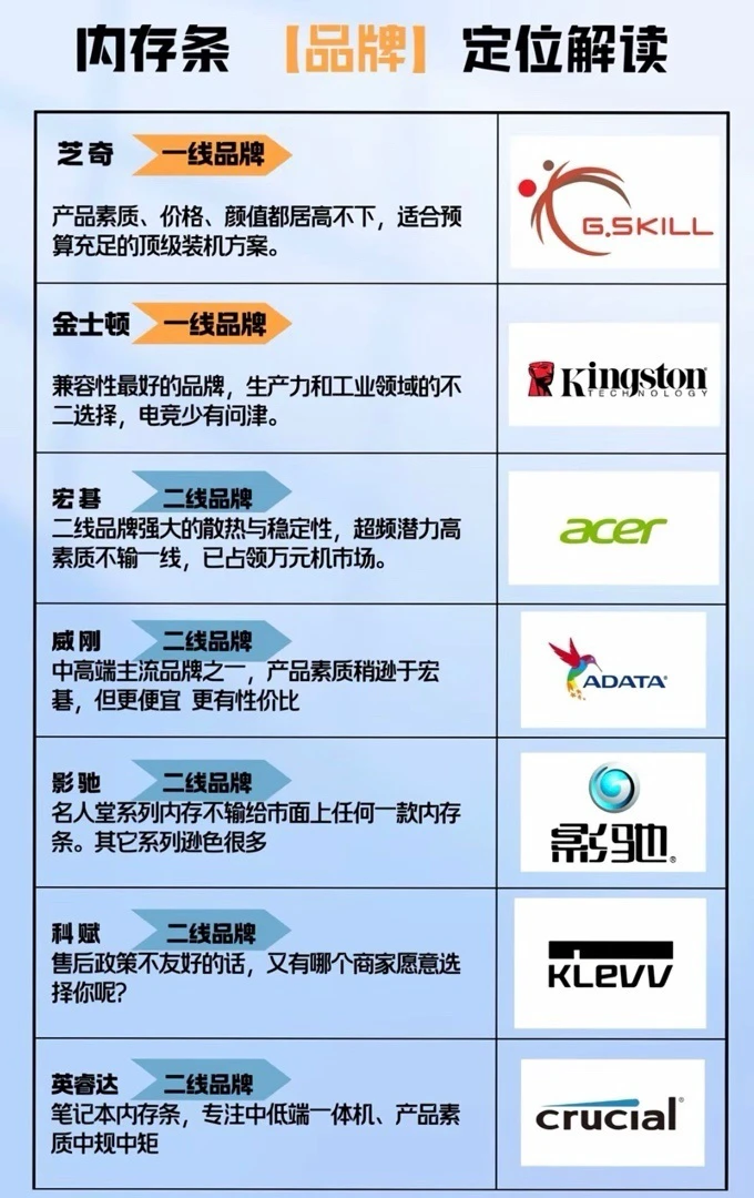内存有频率、时序、颗粒、容量、品牌,这么多条件挑选起来十分的麻烦,很多人都很难挑选到一款好的内存,现在市面上内存的品牌我大致评价了一下,但品牌并不是重要的只是售后跟质量方面。