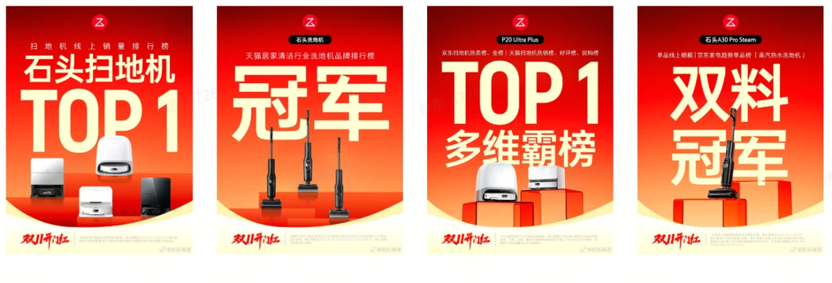 在海外市场取得亮眼成绩的同时,石头科技在国内市场也保持着积极的增长。近期的双十一大促中石头全品类产品斩获多个榜单TOP1,取得开门红的好成绩。