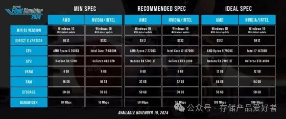 目前网上流出的《微软飞行模拟2024》配置要求图,最低要求内存16GB、硬盘50GB;建议配置内存32GB、硬盘50GB;最佳配置内存64GB、硬盘50GB。