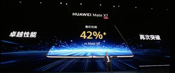 快科技11月25日消息,今天的华为新品发布会上,余承东宣布华为最新折叠屏手机Mate X7整机性能相比上代Mate X6提升了42%。