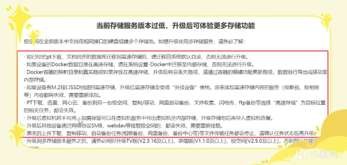 ▼对于注重NAS数据安全性的用户来说,系统并不是更新的越勤快越好,稳定性与数据安全性才是第一要务。早前极空间更新升级过一次存储池,原本用来做存储数据的m.2 SSD必须先将数据备份出来,升级完之后该SSD将只能外部挂载,对于原本就没有部署几个Docker容器的家庭用户来说可能这没什么,但是对于企业来说,这很有可能足以让运维人员加几晚的班,甚至可能影响到整个公司的工作流程运作。