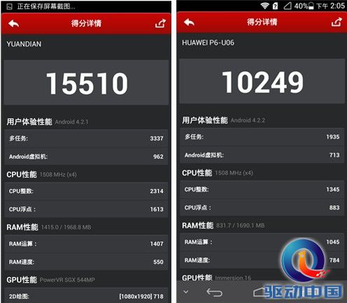 安兔兔4.0在P6上的跑分很奇怪,可能和华为海斯的芯片兼容性有关系,整体分数最低到过9108,最高到13546,多次测试验证,大部分结果在10000-10500之间,所以取中间值10249(P6为联通定制机,不知道是否和预置的应用有关)。