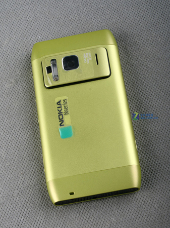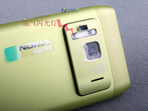 这张图片就是N8摄像头部分的特写,可以看到的是1200万像素摄像头和闪光灯还是占据了不小的空间,这也让该部分凸出了一块。不过摄像头还是可以得到很好的保护,而且氙气闪光灯夸张的外形也在这张图片中显现无余。