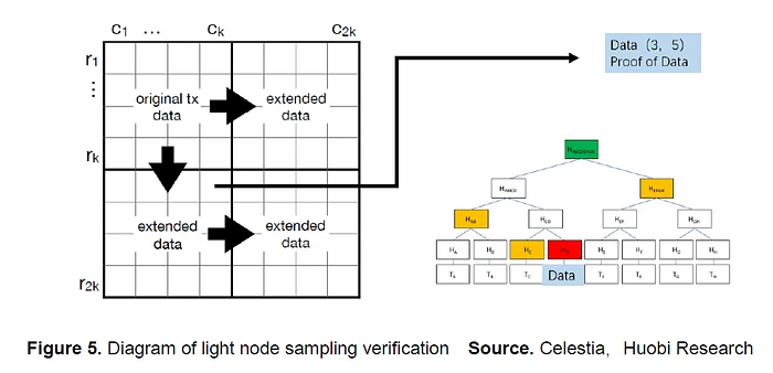 Celestia 的想法是让许多轻节点来分担这项任务。通过将一批数据分解成小块,每个轻节点只需要下载少量数据,就可以非常高的概率验证该区块中的数据是否可用。通过这种方式,轻节点的力量被调动起来,共同维护数据可用性网络。此外,由于每个轻节点只需要验证少量数据,因此轻节点越多,可以验证并变得对网络可用的数据就越多。当然,这也需要在网络上有足够数量的轻节点,否则由于缺少样本而无法完成验证。