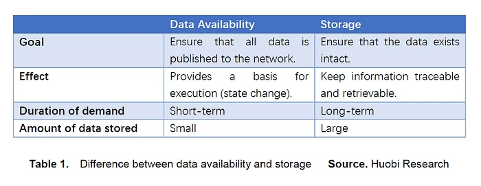 数据可用性涉及数据的存储和检索,但这个问题与存储不同;两者有不同的关注领域。存储需要保持数据随时可用,以便在更长的时间内检索,在此期间数据是有意义的。数据可用性需要确保主区块链网络生成的最新交易数据已发布到网络(可能是其自身之外的其他网络)并且易于访问。