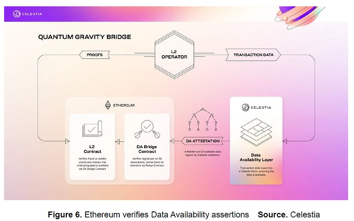在 Celestia 网络内就存储在一个区块中的数据的可用性达成共识后,Celestia 要求法定数量的节点共同签署数据根(交易数据的 Merkle 根)以生成数据可用性证明,表明他们已在网络上存储和发布了该批数据。部署在以太坊主网上的 Quantum Gravity Bridge 合约验证节点的签名,如果通过,则认为这些数据在 Celestia 上可用。