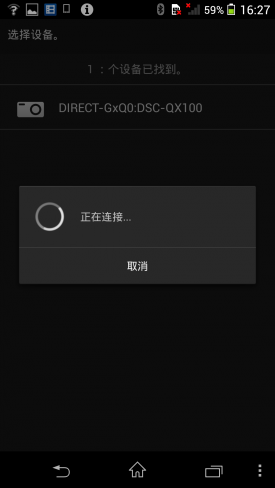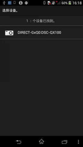 另外,某些不支持NFC功能的手机,可以通过WIFI进行连接,它本身将会建立一个无线WIFI的域,用自己的手机或者平板产品连接这个域,然后打开软件,选择QX100选择这台相机即可,仅首次连接时需要输入密码。