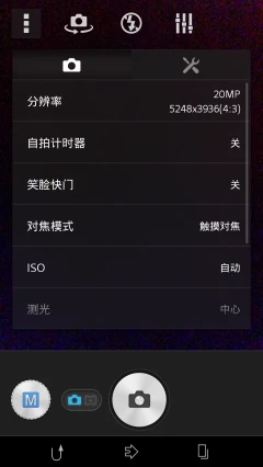 高级自动模式下,拍摄视频和照片相机会自动选择最佳设置。手动模式下可以让用户自动调节对焦模式、ISO、测光点、曝光补偿、白平衡等参数。需要注意的是在高级自动模式下无法选择照片的尺寸,默认为800万。而手动模式下可以调节拍摄像素,提供200万(16:9)、300万(4:3)、800 万(16:9)、800万(4:3)、2000万(4:3)五种选择。当选择到2070万像素时,拍摄样张的大小约为5MB。
