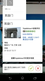 Info-eye功能是让用户深入了解取景器中所拍景物内容,说简单点就是帮助你快速的获悉你需要的信息,方法就是将手机对准你想了解的物体,可以是书籍、条码、文字、葡萄酒、地标性建筑,如果网上有这个拍照物体的信息,那么就可以搜索到详细信息。由于环境有限,测试时是从网上选择了几张地标性建筑物的图片,识别率一般,凯旋门、比萨斜塔、埃菲尔铁塔只识别出了其中一张。