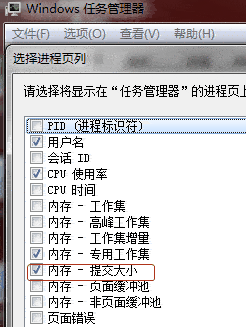 3、刚才的选项很多,有好几个内存的占用情况。其中,专用工作集,就是物理内存占用大小;而提交大小,就是物理内存占用+虚拟内存占用总量。