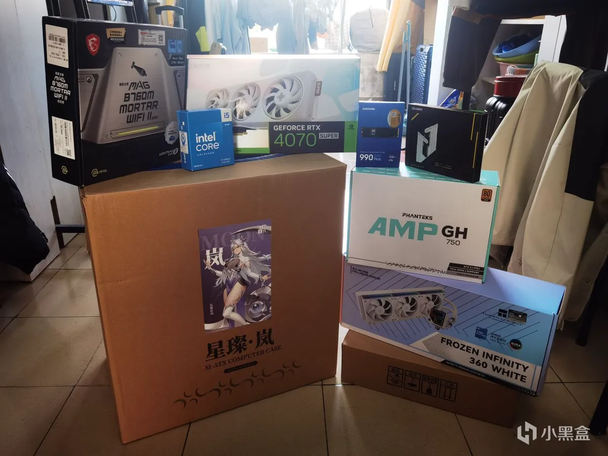 配件购买是碰到好价就买了,没有在两三天之内买齐,可能是我比较爱折腾,买的产品都经过拆箱录制和严格验货,有不满意的都走售后退换货了,这也是这次战线拉长的主要原因。总结来说呢(以我本次购物经历为参考,不代表所有情况),大件还是建议在京东购入,我的板u在pdd购买后,第一次主板内部包装袋破损,第二次io面板有严重磕碰痕迹,接口也被插拔过,最后还是选了京东店铺,不是自营店且价格和pdd一样,到货的主板就很新了。显卡我在抖音用了400元券,但发货后物流显示京东物流,最后查了店铺信息才发现地址和京东的店是一样的,显卡也很新,查sn码是11月的,其他配件在确定好参数后就按着销量和口碑挑了。因为是第一次装,颜值也是拉高点,选择了白色海景房,附一张全配件图。