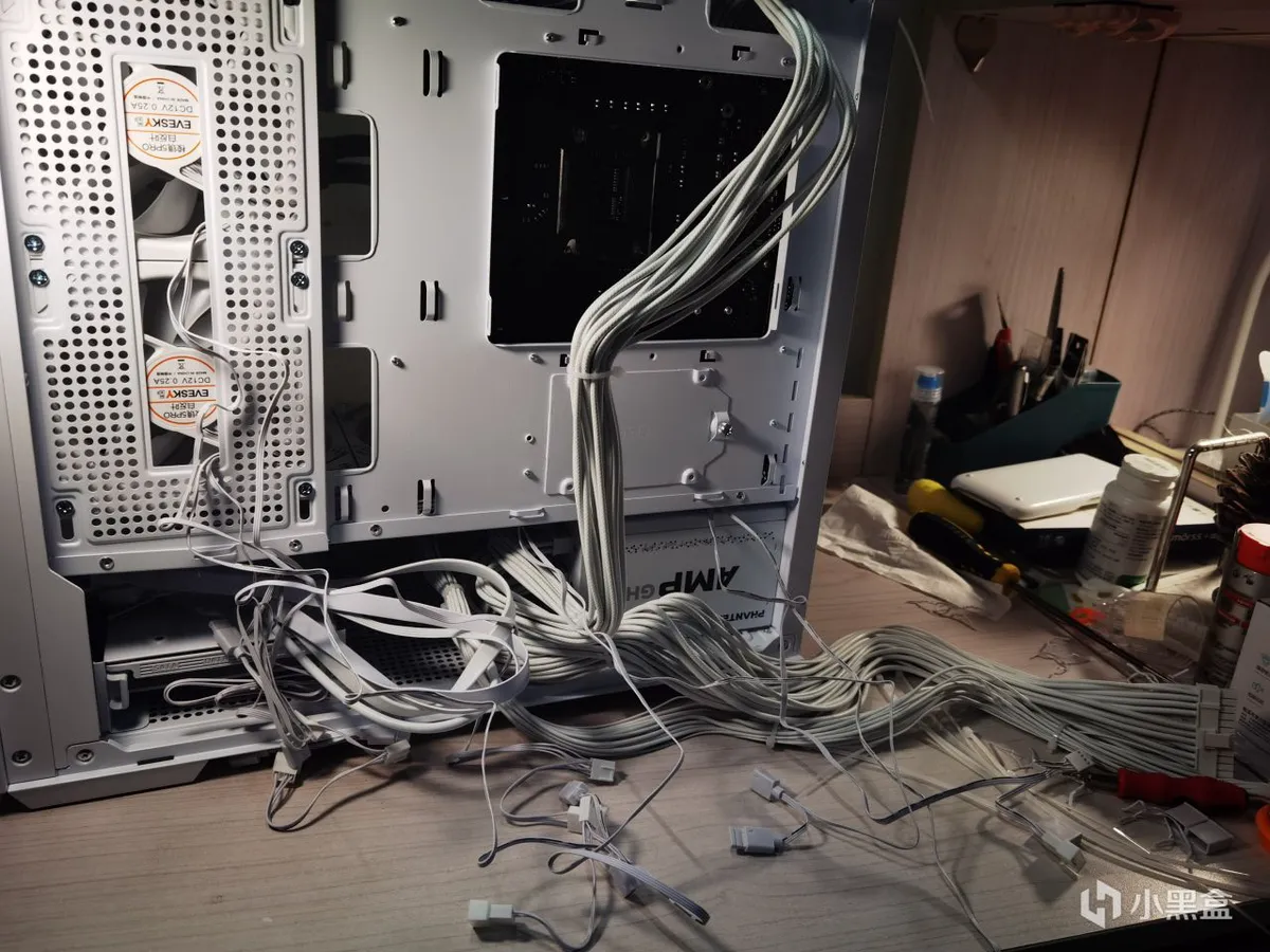 目前为止最难安装的是水冷的冷头,上下螺丝的卡位很恶心,而且操作空间很狭小。然后注意cpu供电线一定要在冷排安装之前插好,不然就等着拆冷排吧接下来就是风扇的串联接线,把风扇线拆开后,看到背面密密麻麻的散线,我们一致认为先午休再继续,附图。
